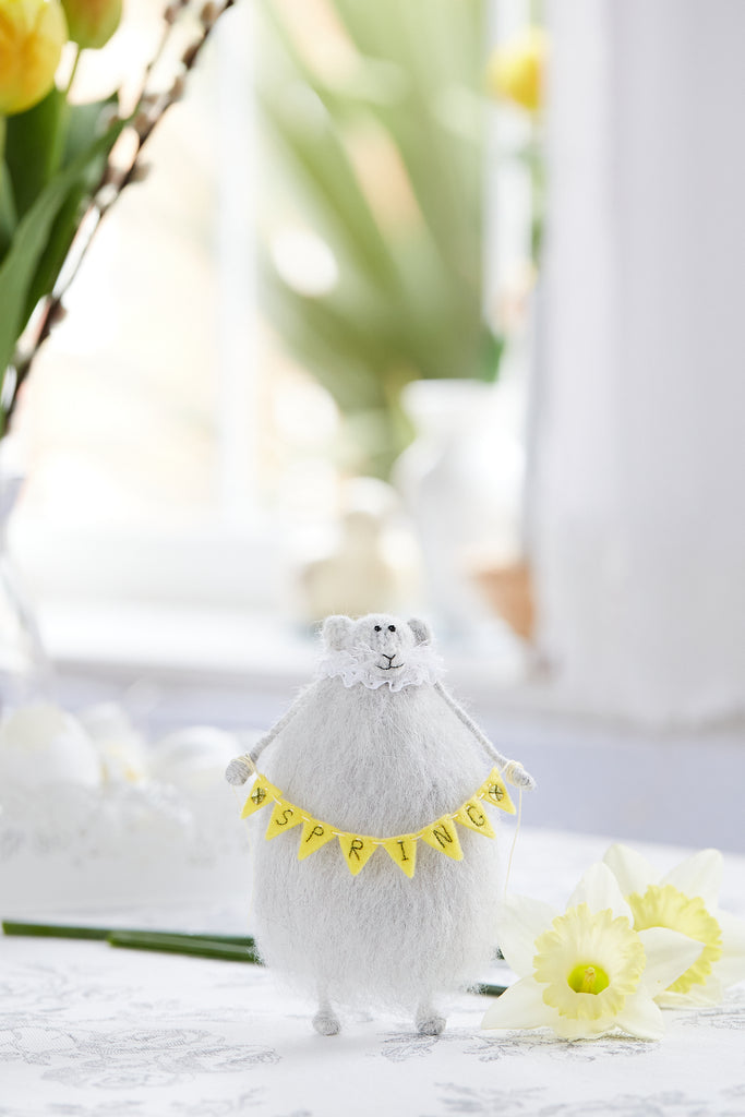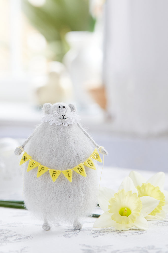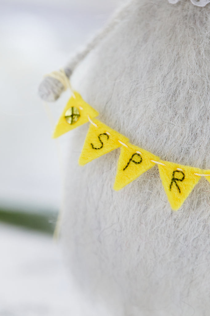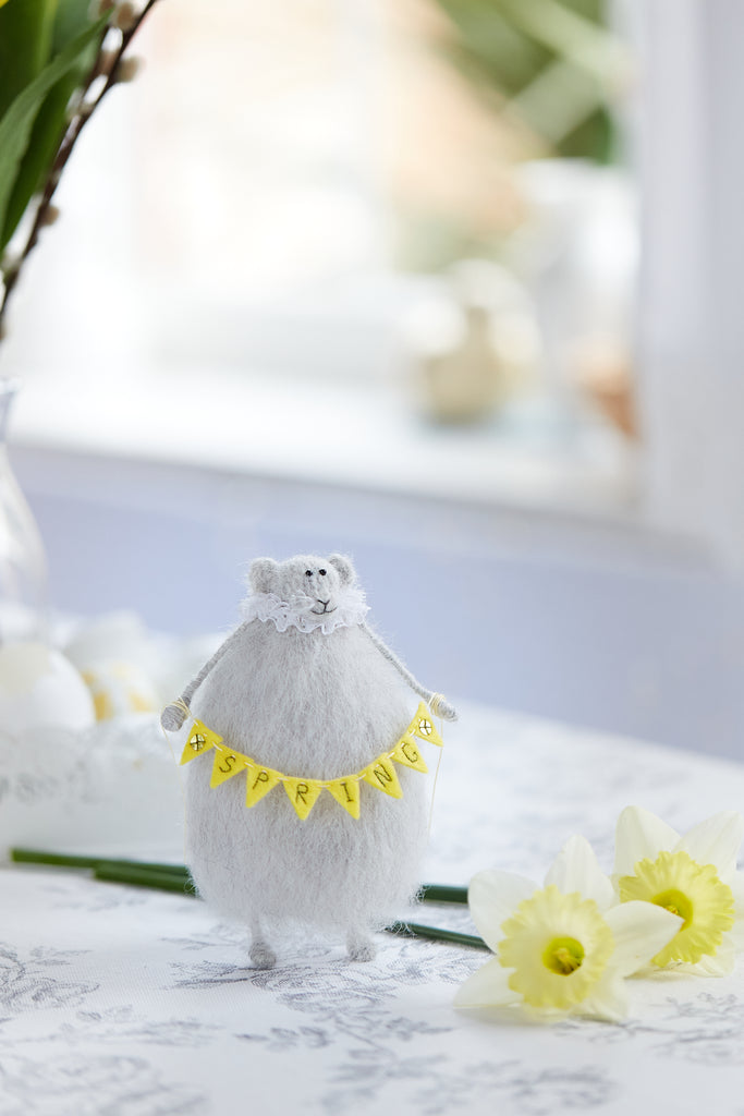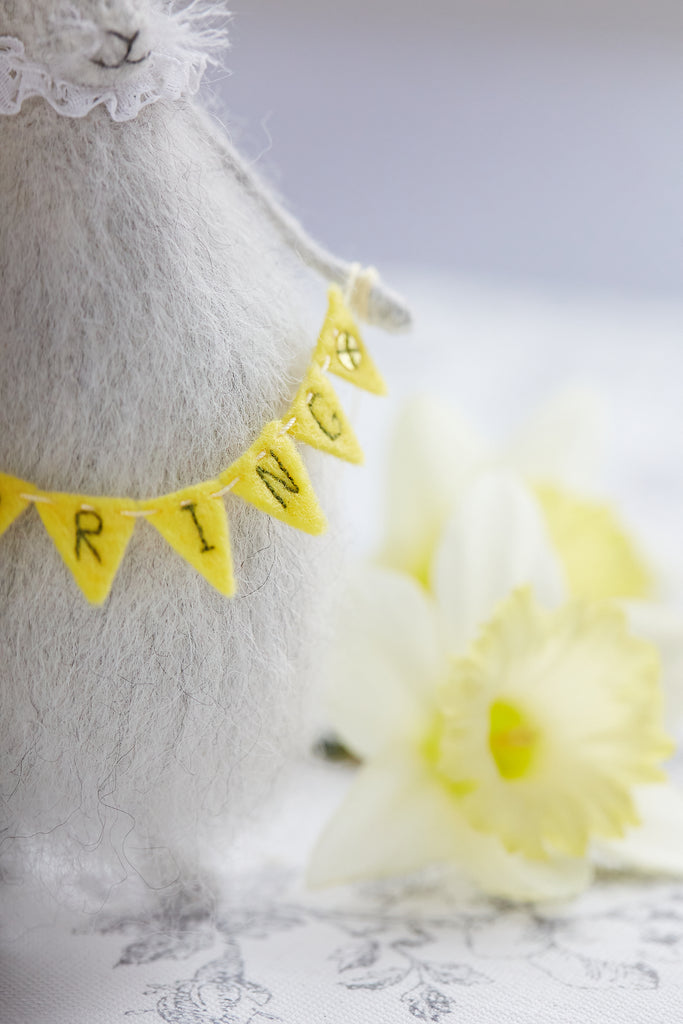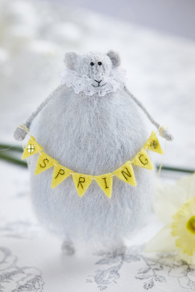 Fluffy spring mouse/rat in lighter grey with a contrasting sunshine yellow bunting would make a lovely seasonal gift for Mothers Day, Easter, a spring birthday or any other occasion. The message on the flags can be personalised - leave a note at the checkout with a preferred word of 6-8 letters maximum.